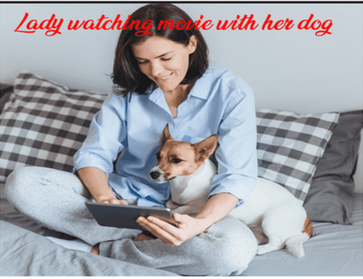 Im.text((15,15), "Lady watching movie with her dog", (255,0,0), font=mf)