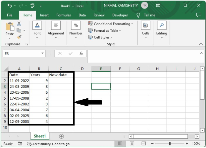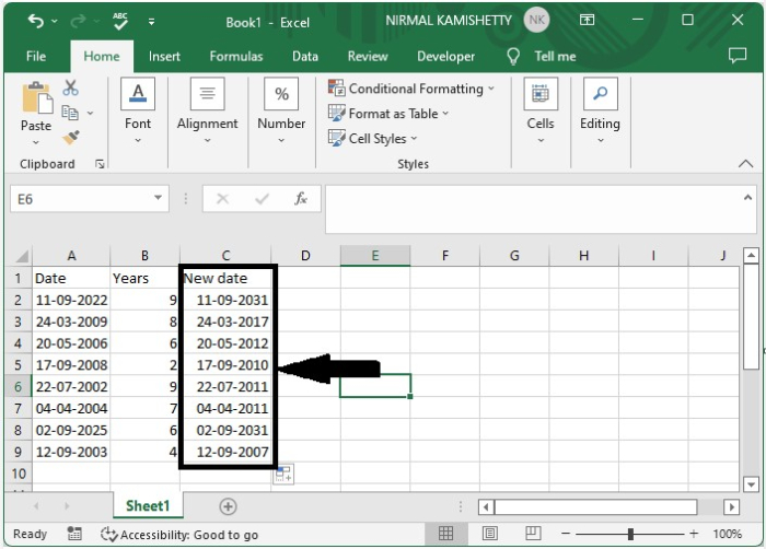 在這裡,我們將使用 DATE 公式獲得其中一個結果,然後使用自動填充柄獲取所有結果。讓我們看看在 Google Sheet 中向日期新增年數的簡單步驟。