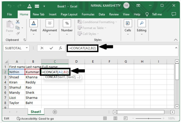 開啟一個 Excel 表格,並在前兩列中插入一組員工的名字和姓氏。接下來,選擇第二列旁邊的單元格,並在公式框中插入公式CONCAT(A2, B2),這將組合前兩個名稱以建立全名。