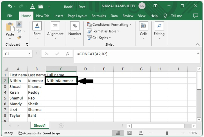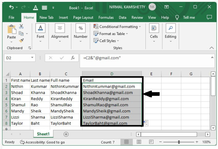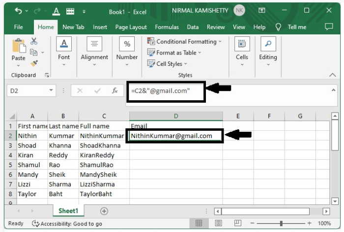 連線名字和姓氏後,您需要在全名的末尾新增@gmail.com以獲取第一個人的電子郵件地址。為此,請使用公式=C2&"@gmail.com"