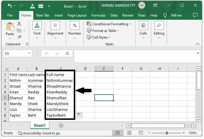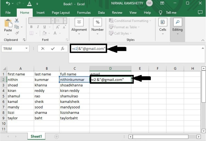 我們可以遵循一個簡單的過程來向姓名列表新增電子郵件地址。基本上,此過程包含兩個部分,第一步是連線名字和姓氏,第二步是為每個文字新增@gmail.com。