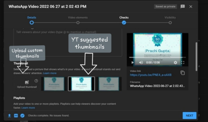 縮圖已上傳,以提高您的頻道觀看次數。點選下一步,透過選擇影片的不同引數來完成釋出影片。