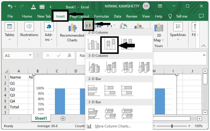 要建立二維柱狀圖,請在選擇資料後,從“插入”選單下的“圖表”部分中選擇“二維柱狀圖”。