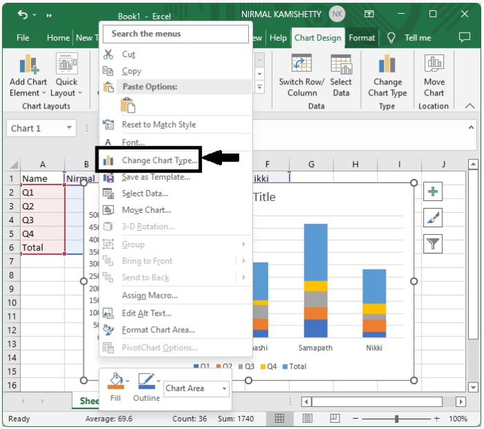 現在,右鍵單擊圖表區域,然後從選單框中選擇“更改圖表型別”。