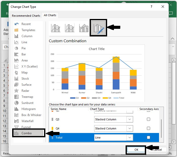 將顯示一個彈出選單。從左側下拉列表中選擇“組合”,選擇“自定義”,並將除“總計”以外的所有型別設定為“堆疊柱狀圖”,並將“總計”設定為“折線圖”,如下圖所示。