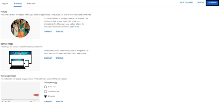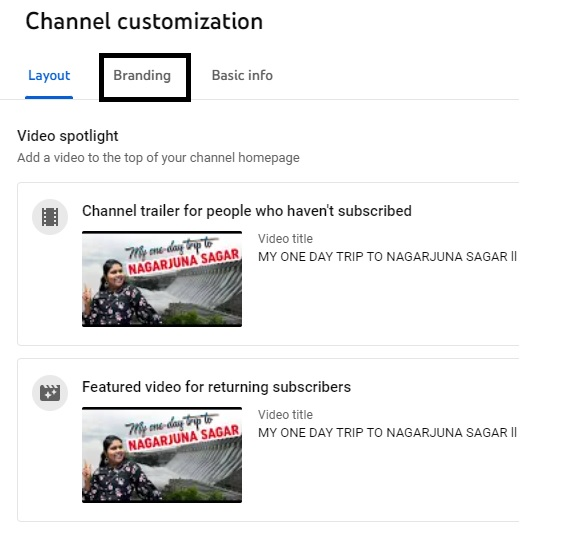 - 步驟 3 - 你將被帶到頻道自定義頁面。在這裡你會找到三個部分。點選品牌部分。