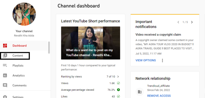 - 步驟 2 - 點選YouTube Studio後,頁面將顯示(如下所示)。在左側角,你會找到內容選項卡。點選內容。