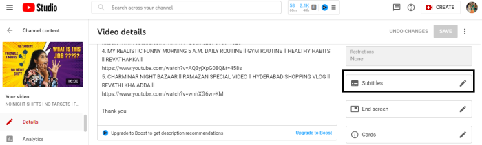 - 步驟 4 - 點選所選影片(如下所示),影片詳情頁面將開啟。在影片詳情頁面中,向下滾動,在左側角底部,你會找到字幕部分。點選字幕。