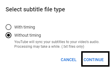 - 步驟 6 - 點選上傳檔案,將開啟一個單獨的視窗(如下所示)。選擇字幕檔案型別 - 帶時間或不帶時間(根據你的選擇),然後點選繼續。