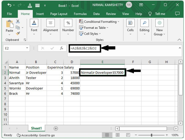 要獲得第一個結果,請單擊一個空單元格,在其中鍵入=A2&B2&C2&D2,然後按Enter鍵。