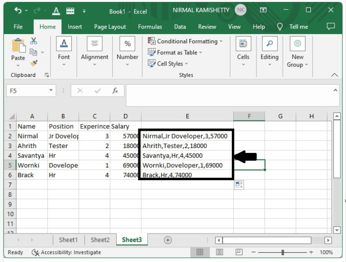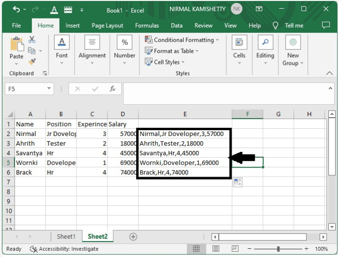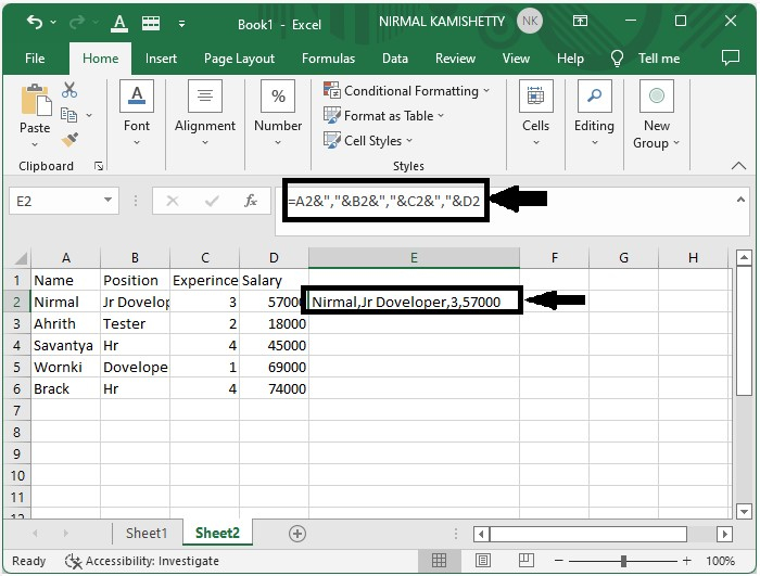 我們可以看到,資料非常混亂。我們可以透過在公式之間新增","來解決這個問題,使其變為=A2&","&B2&","&C2&","&D2,然後單擊Enter鍵。然後資料將用逗號整齊地分隔。