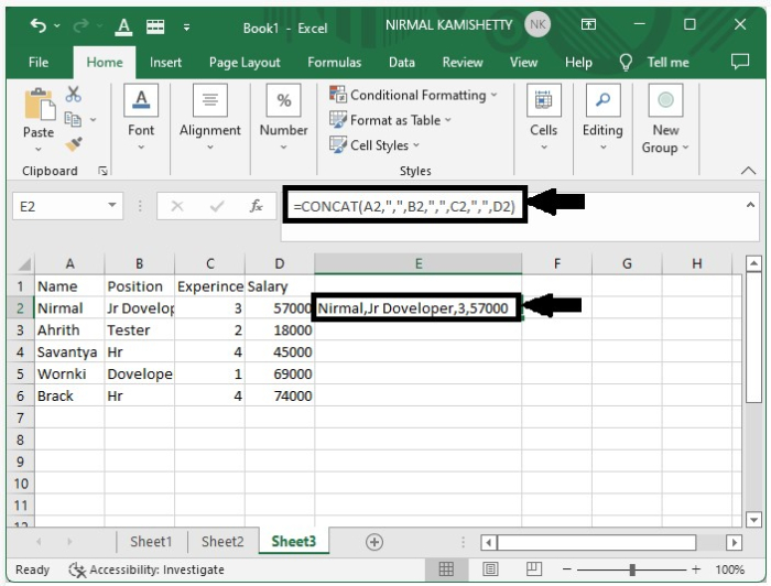 要獲得第一個結果,請選擇空單元格並在公式框中輸入公式=CONCAT(A2,",",B2,",",C2,",",D2,然後按Enter鍵。