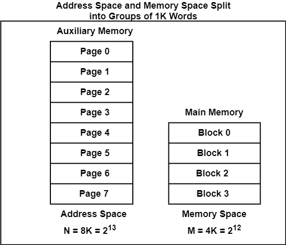 示例 - 假設一臺計算機的地址空間為8K,記憶體空間為4K。如果它們都分成1K字的集合,我們將得到八個頁面和四個塊,如圖所示。