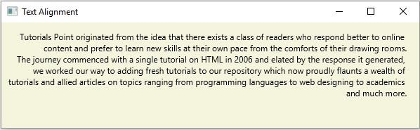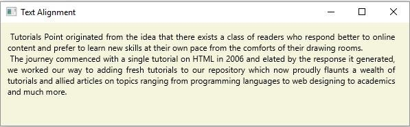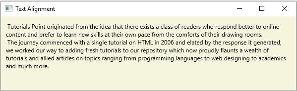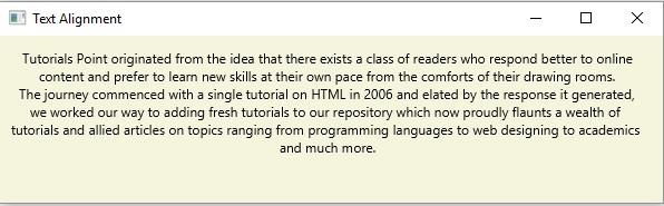 文字對齊是指文字在邊界框內的水平排列方式。您可以使用 setTextAlignment() 方法調整文字的對齊方式。此方法接受名為 *TextAlignment* 的列舉的常量之一,並相應地調整文字。此列舉提供 3 個常量: