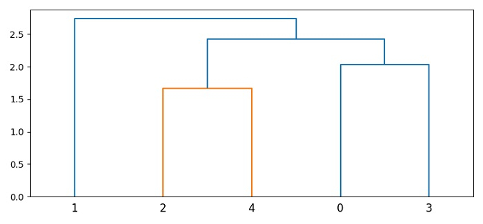 from matplotlib import pyplot as plt from scipy.cluster.hierarchy import dendrogram, linkage import numpy as np plt.rcParams["figure.figsize"] = [7.50, 3.50] plt.rcParams["figure.autolayout"] = True a = np.random.multivariate_normal([0, 10], [[3, 1], [1, 4]], size=[2, ]) b = np.random.multivariate_normal([0, 10], [[3, 1], [1, 4]], size=[3, ]) X = np.concatenate((a, b), ) Z = linkage(X) fig = plt.figure() ax = fig.add_subplot(1, 1, 1) dendrogram(Z, ax=ax) plt.show()