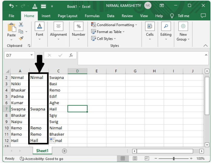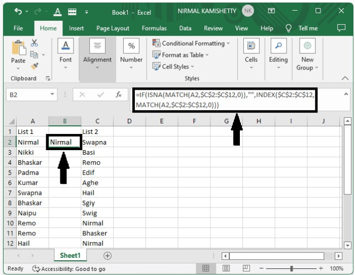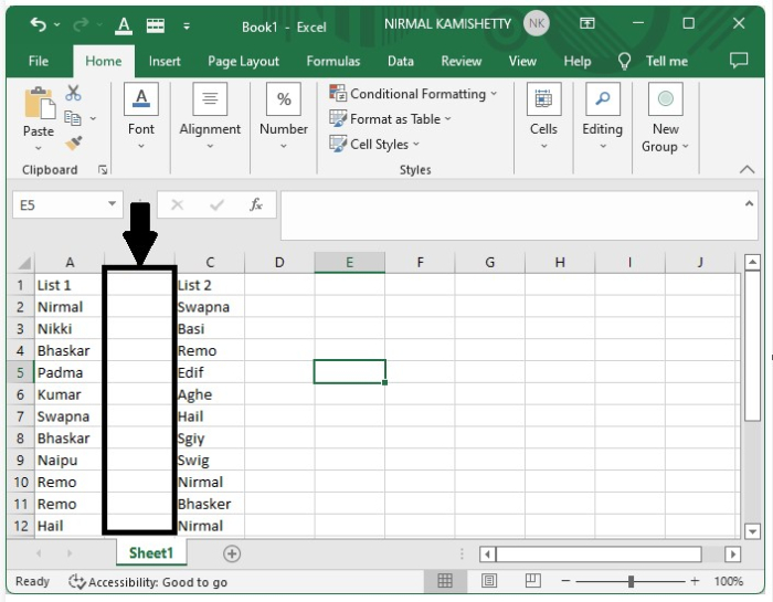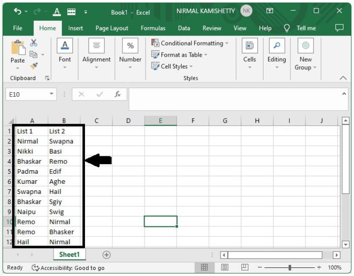 開啟一個Excel表格,其中包含兩列姓名列表。