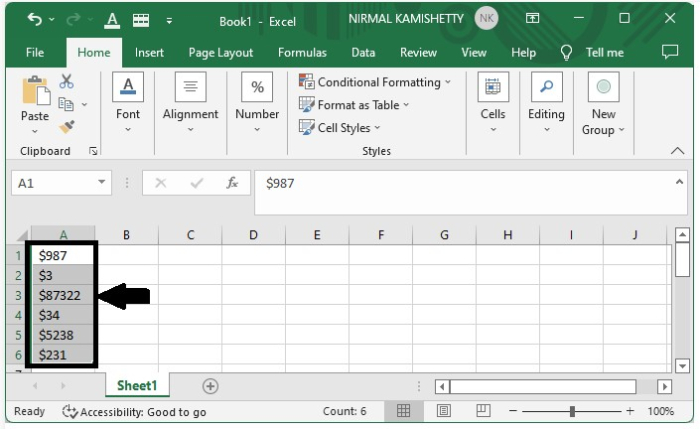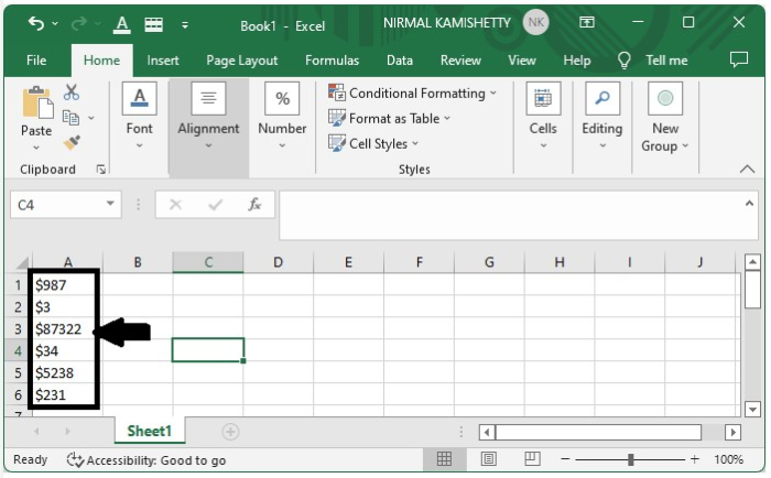 假設我們有一個 Excel 表格,其中一列值為包含$符號,如下面的螢幕截圖所示。