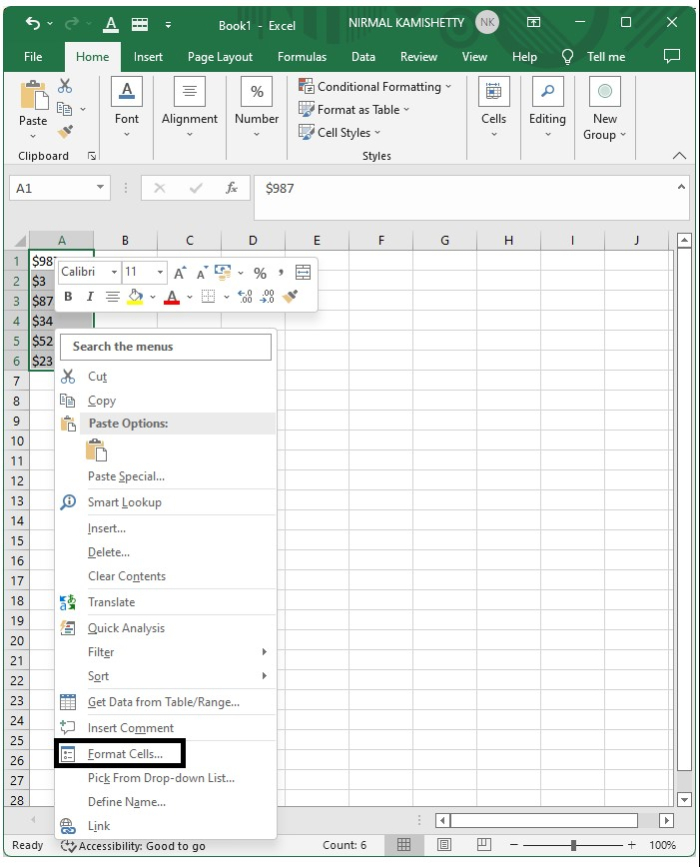 要將美元符號左對齊,請選中資料並右鍵單擊它們,然後從選單框中選擇“設定單元格格式”選項,如下面的圖片所示。