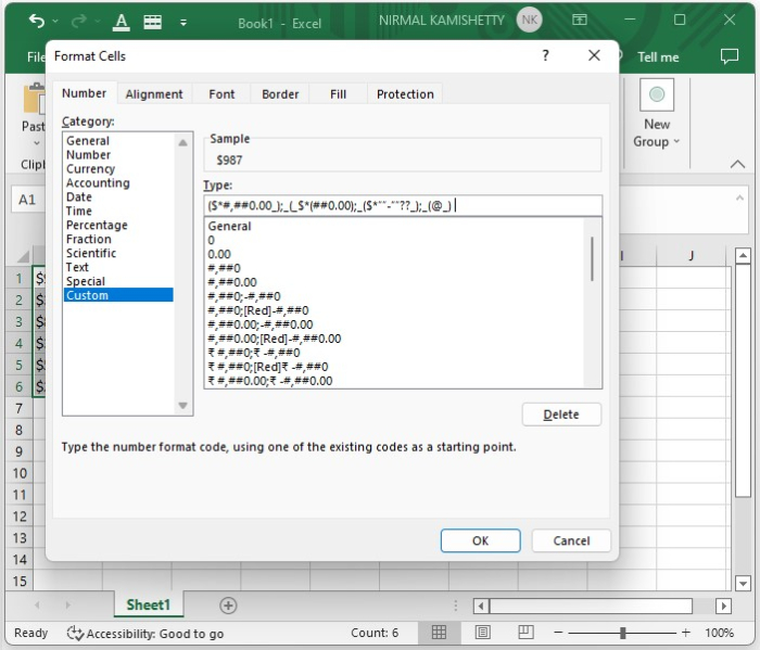 將開啟一個新的彈出選單。在同一個彈出選單中,在“數字”標題下選擇“自定義”,並在“型別”文字框中輸入公式($*#,##0.00_);_(_$*(##0.00);_($*""-""??_);_(@_),然後單擊“確定”,然後我們可以看到該列中的所有$符號都將左對齊到單元格,並且所有數字都將右對齊,如下面的圖片所示。