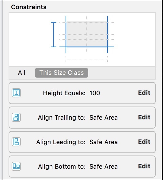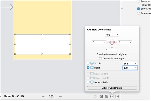 在設定約束時,我們需要記住4個引數:X軸、Y軸、高度和寬度,我們應該確保提供所有四個引數。如果其中任何一個未提供或未處理,應用程式的UI可能會出現異常行為,甚至可能崩潰。在本例中,我們將UIView與底部、前導和尾隨空間對齊為0點,如果您希望保留一些間距,則可以提供5或10點。在本例中,我們將提供前導空間0點,尾隨空間0點,底部空間0點,高度100點。