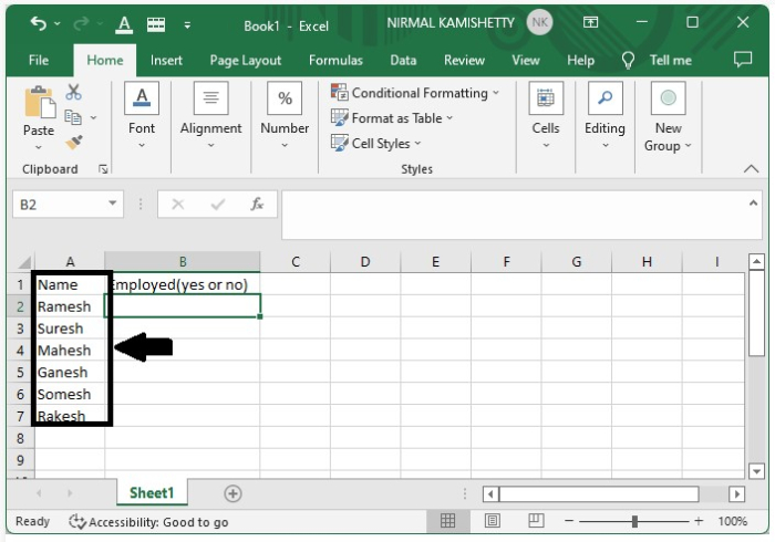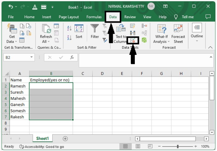 這裡,我們首先新增資料驗證,然後編輯錯誤訊息。讓我們看一個簡單的例子,瞭解如何在Excel中僅允許輸入“是”或“否”。