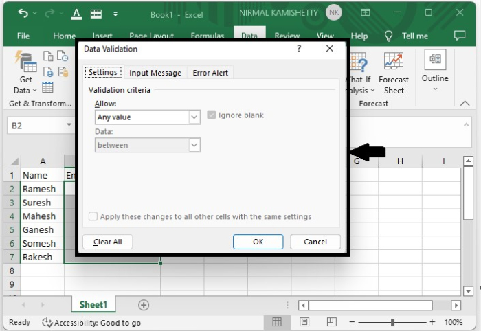 現在,點選快速訪問工具欄上的“資料”,然後選擇“資料驗證”。將開啟一個彈出視窗,如下所示。