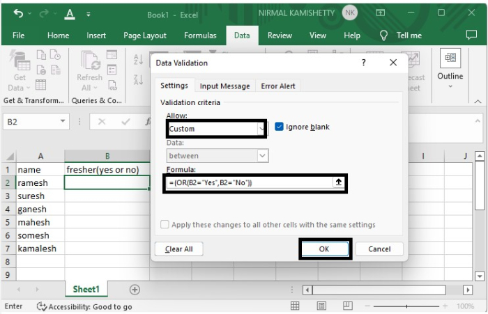 =(OR(B2="YES",B2="NO")),然後點選“確定”以完成我們的過程,如下面的圖片所示。