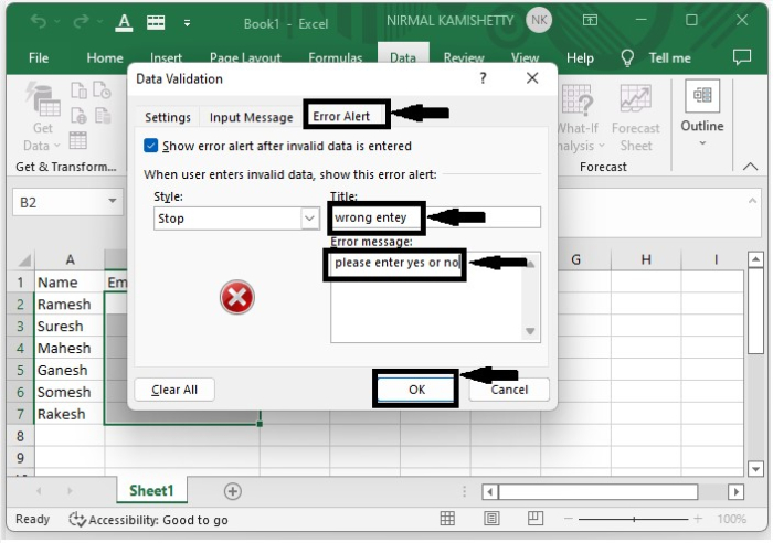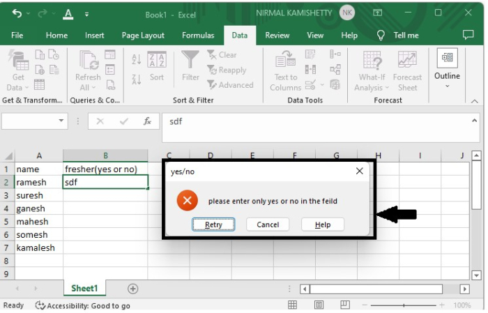 如果我們嘗試在第二列中輸入“是”或“否”以外的任何值,則會顯示一條錯誤訊息,如下面的螢幕截圖所示。