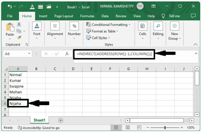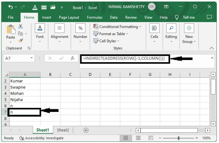 現在,選擇最後一個單元格。在此過程中,我們使用公式=INDIRECT(ADDRESS(ROW()-1,COLUMN()))。此公式不基於單元格的地址(所有其他公式都這樣做);此公式基於當前單元格。