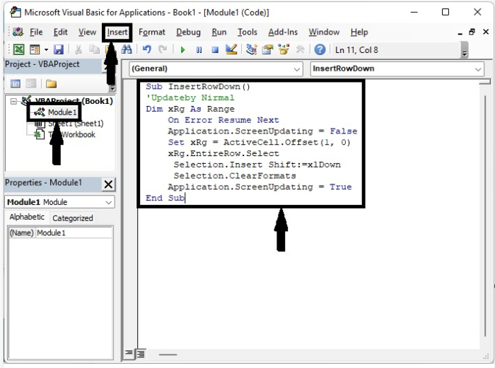 要在下方面插入行,請右鍵單擊工作表名稱並選擇“檢視程式碼”以開啟 VB 程式碼,然後插入,選擇“插入模組”,並在文字框中輸入程式,如下圖所示。