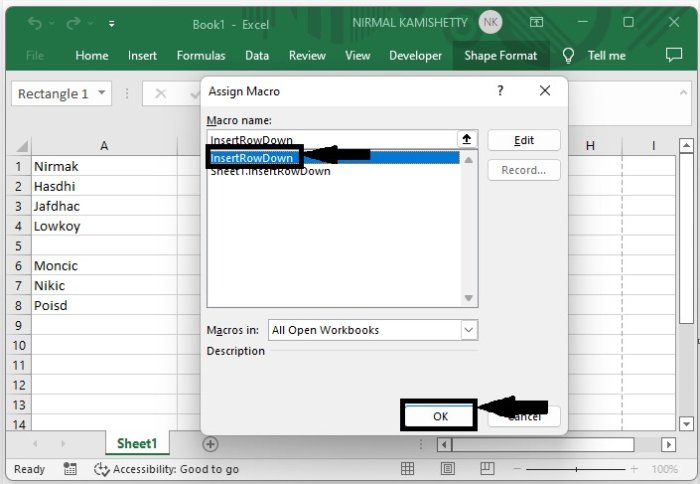 現在,在宏名稱中,選擇“插入下方行”並單擊“確定”以建立按鈕在下方面插入新行。