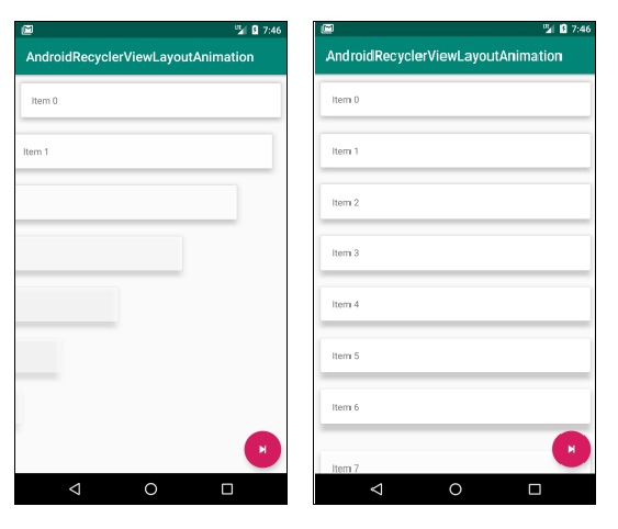 <?xml version="1.0" encoding="utf-8"?> <android.support.constraint.ConstraintLayout xmlns:android="http://schemas.android.com/apk/res/android" xmlns:app="http://schemas.android.com/apk/res-auto" xmlns:tools="http://schemas.android.com/tools" android:layout_width="match_parent" android:layout_height="match_parent" tools:context=".MainActivity"> <android.support.v7.widget.RecyclerView android:id="@+id/recyclerView" android:layout_width="match_parent" android:layout_height="wrap_content" android:layoutAnimation="@anim/layout_animation_up_to_down" app:layoutManager="android.support.v7.widget.LinearLayoutManager" app:layout_constraintBottom_toBottomOf="parent" app:layout_constraintLeft_toLeftOf="parent" app:layout_constraintRight_toRightOf="parent" app:layout_constraintTop_toTopOf="parent" /> <android.support.design.widget.FloatingActionButton android:id="@+id/fab" android:layout_width="wrap_content" android:layout_height="wrap_content" android:layout_margin="8dp" android:src="@android:drawable/ic_media_next" app:layout_constraintBottom_toBottomOf="parent" app:layout_constraintRight_toRightOf="parent" /> </android.support.constraint.ConstraintLayout>