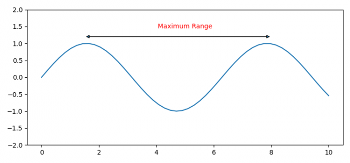 import matplotlib.pyplot as plt import numpy as np plt.rcParams["figure.figsize"] = [7.50, 3.50] plt.rcParams["figure.autolayout"] = True xx = np.linspace(0, 10) yy = np.sin(xx) fig, ax = plt.subplots(1, 1) ax.plot(xx, yy) ax.set_ylim([-2, 2]) ax.annotate('', xy=(5,2), xytext=(8,2), xycoords='data', textcoords='data', arrowprops={'arrowstyle': '<|-|>'}, color='yellow') ax.annotate('Maximum Range', xy=(5,5), ha='center', va='center', color='red') plt.show()