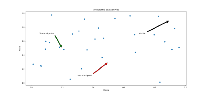 # Import necessary libraries import matplotlib.pyplot as plt import numpy as np # Create data points to be plotted x = np.random.rand(30) y = np.random.rand(30) # Define the scatter plot using Matplotlib fig, ax = plt.subplots() ax.scatter(x, y) # Add annotations to specific data points using text or arrow annotations ax.annotate('Outlier', xy=(0.9, 0.9), xytext=(0.7, 0.7),arrowprops=dict(facecolor='black', shrink=0.05)) ax.annotate('Important point', xy=(0.5, 0.3), xytext=(0.3, 0.1),arrowprops=dict(facecolor='red', shrink=0.05)) ax.annotate('Cluster of points', xy=(0.2, 0.5), xytext=(0.05, 0.7),arrowprops=dict(facecolor='green', shrink=0.05)) # Adjust the annotation formatting as needed plt.title('Annotated Scatter Plot') plt.xlabel('X-axis') plt.ylabel('Y-axis') # Show the scatter plot with annotations plt.show()