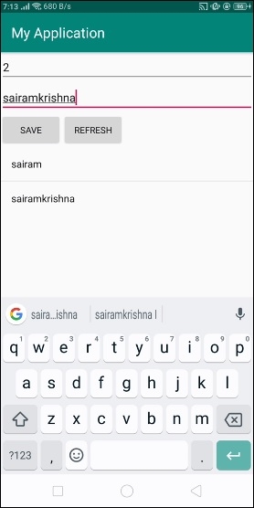 在上面的程式碼中,我們使用EditText獲取名稱和記錄編號,當用戶點選儲存按鈕時,它會將資料儲存到ArrayList中。點選重新整理按鈕以獲取ListView的更改。