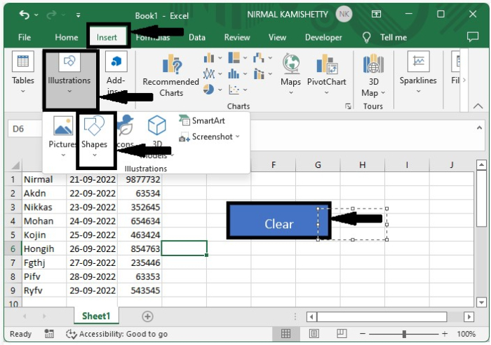 現在要建立按鈕,點選“插入”和“插圖”,然後在“形狀”下選擇“矩形”,然後繪製一個矩形並將其命名為“清除”,如下圖所示。