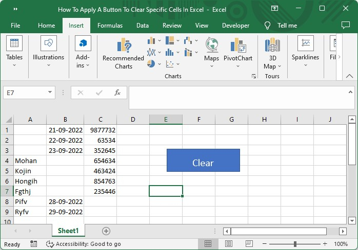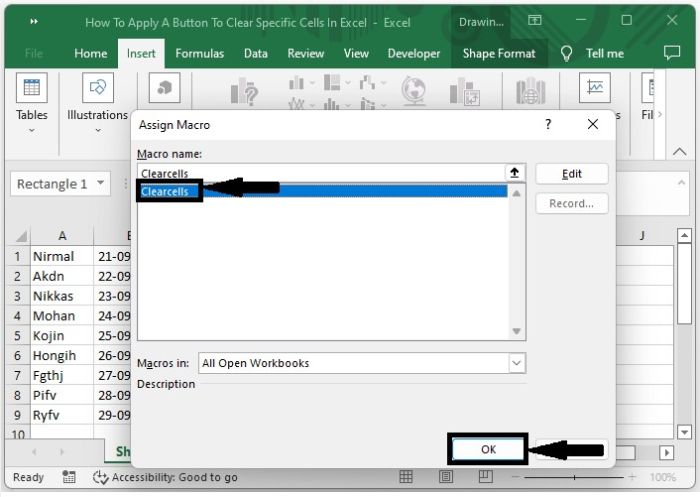 首先,我們將插入一個形狀,然後為其分配一個宏。讓我們來看一個簡單的過程,瞭解如何應用按鈕來清除特定單元格。由於此過程無法輕鬆完成,我們需要使用VBA應用程式來完成。