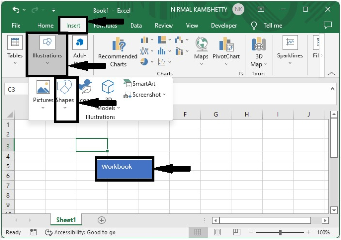 讓我們考慮一個新的 Excel 工作表,然後在工作表上繪製一個矩形按鈕,方法是單擊“插入”,“插圖”,然後選擇如下圖所示的形狀。