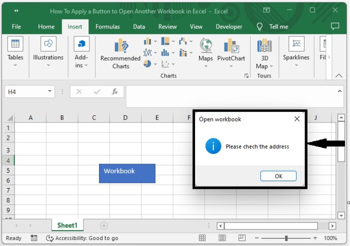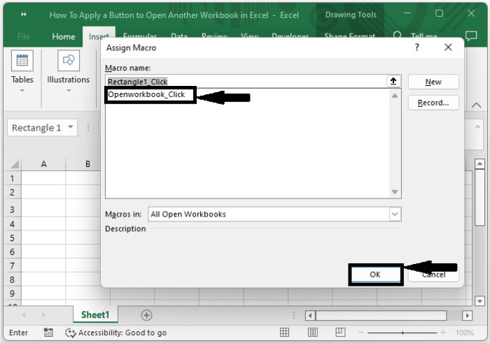 在這裡,我們將首先插入一個形狀,然後為其分配一個宏。讓我們看一個簡單的過程,瞭解如何在 Excel 中使用按鈕開啟另一個工作簿。