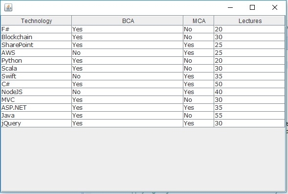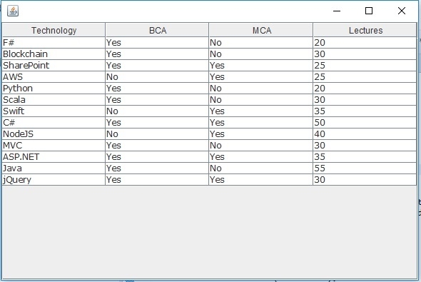 tableModel.addRow(new Object[] { "Blockchain", "Yes", "No", "30"});