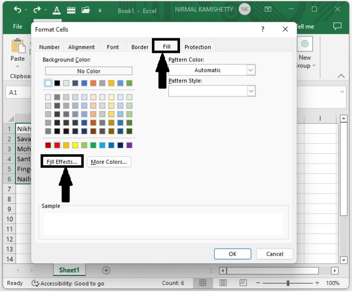 在新彈出的視窗中,選擇要用於填充單元格的顏色,然後選擇水平陰影樣式。單擊“確定”關閉彈出視窗,然後再次單擊上一個彈出視窗上的“確定”以關閉彈出視窗,如下面的影像所示。