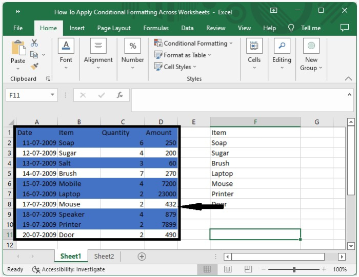 在這裡,我們將首先將資料放入一個工作表中,然後將條件格式應用於獲取的資料。讓我們來看一下在Excel中將條件格式應用於多個工作表的一種快速方法。