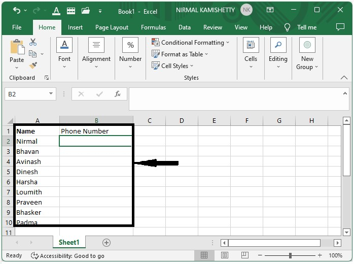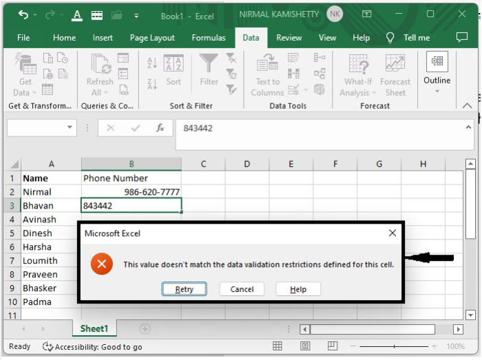 在這裡,我們將首先設定單元格格式,然後使用條件格式僅允許數字格式,然後編輯訊息。讓我們看看一個簡單的過程,如何在 Excel 中應用資料驗證以強制電話號碼格式。