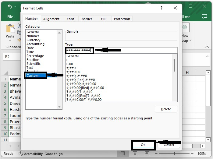 再次,在新彈出視窗中,單擊“自定義”,然後將型別輸入為“###-###-####”,然後單擊“確定”關閉彈出視窗。