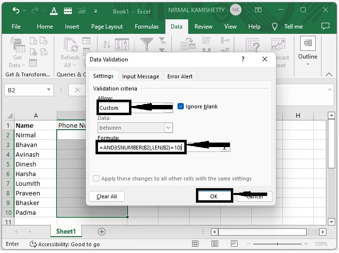 在新彈出的視窗中,將“允許”選擇為“自定義”,並在公式框中輸入公式:=AND(ISNUMBER(B2),LEN(B2)=10),然後按“確定”完成此過程。