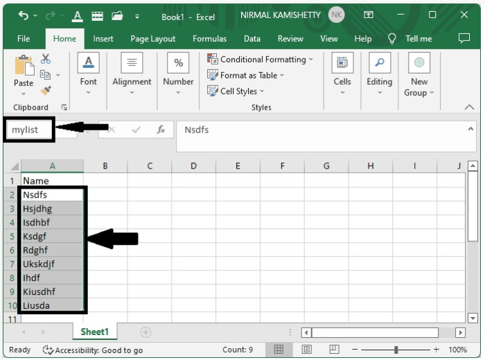 首先,選擇工作表中存在的資料並建立一個名為 mylist 的列表,然後單擊“輸入”。然後將建立一個列表,如下面的影像所示。