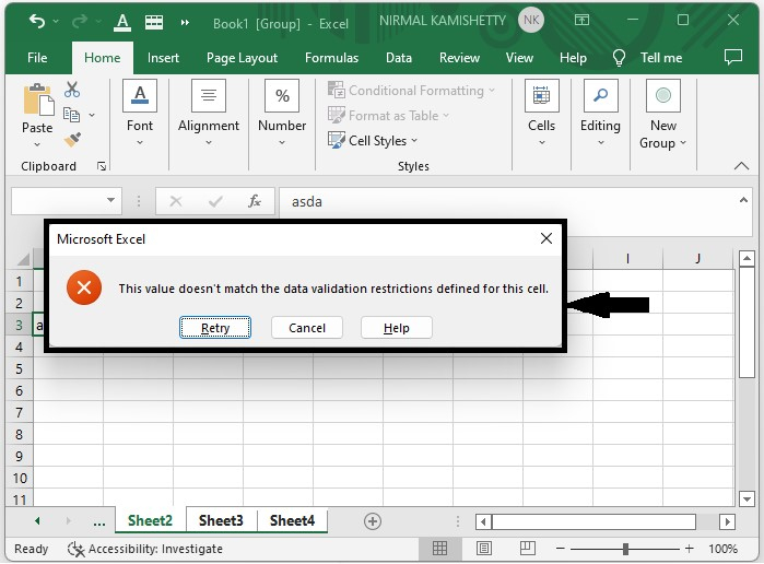 當我們嘗試在任何工作表中輸入除列表之外的資料時,將顯示一條錯誤訊息,如下面的影像所示。