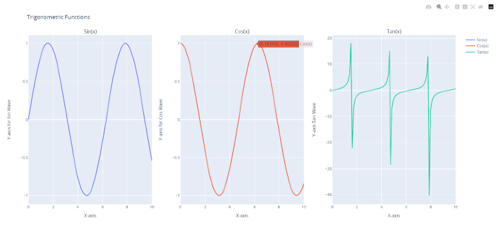 此外,將 subplot_titles 選項傳遞給一個包含三個字串的陣列,其值為“Sin(x)”、“Cos(x)”和“Tan(x)”。這將確定每個網格子圖的標題。