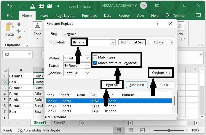 選擇資料並按CTRL + F開啟查詢選單以查詢精確的單詞。在查詢彈出視窗中輸入“Banana”,以檢視要選擇哪些選項以顯示選單。