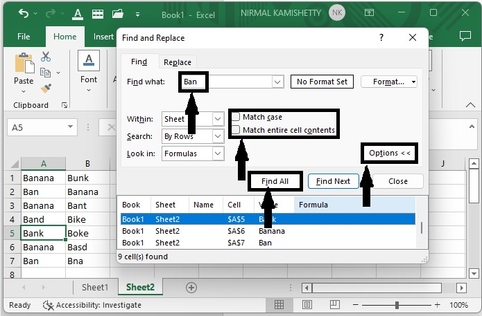 取消選中“區分大小寫”和“匹配整個單元格內容”複選框,然後單擊“查詢全部”以獲取所有近似匹配的單詞,如下面的影像所示。